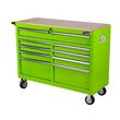 Servante d´atelier en acier comprenant 9 tiroirs en aciers sur glissières à billes avec poigne métal-lique. Fermeture à clé Cadre robuste en acier sur 4 roues : 2 fixes et 2 pivotantes avec frein Diamètre des roues : (Ø 127 x 51 mm) Capacité / poids suppor-té maxi 540 kg Plateau supérieur en bois.