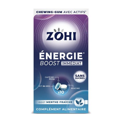 Une formule ENERGIE BOOST IMMEDIAT : un complément alimentaire sous forme de chewing-gum, sans sucres, à la caféine et complété par des vitamines B3, B6 et B12 pour un coup de boost immédiat et pour contribuer à réduire la fatigue.