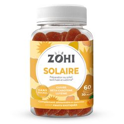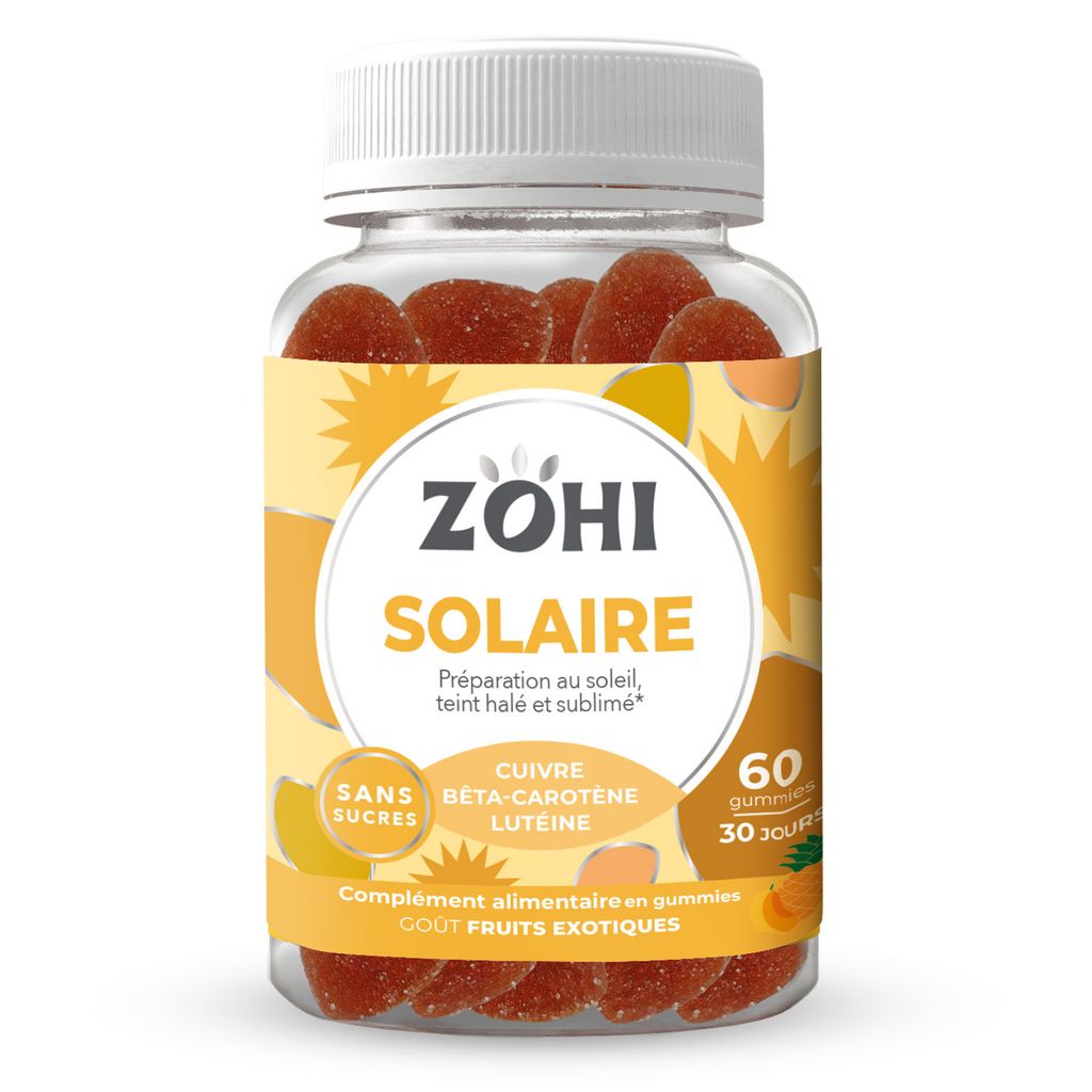Découvrez Zohi, la nouvelle marque de compléments alimentaires qui allie plaisir et efficaité ! Avec sa 1ère gamme de gummies sans sucres, aux bons goûts de fruits, Zohi est fabriqué en France,sans colorants artificiels dans un pilulier recyclable. Zohi Solaire : ce sont des gummies au goût de fruits exotiques favorisant un teint halé et sublimé toute l'année et permettant d'avoir une peau bien préparée au soleil