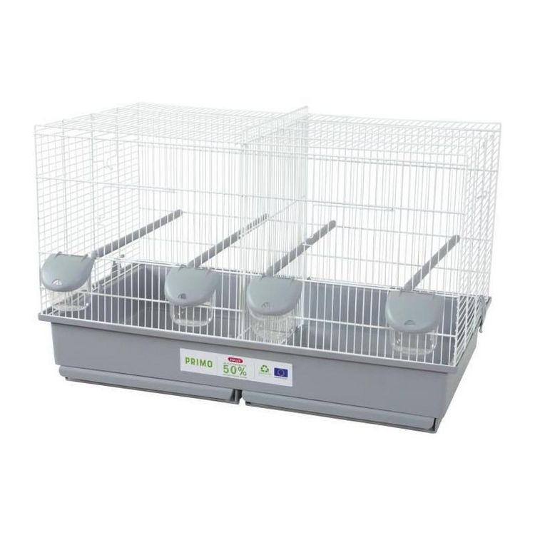 Cette cage en plastique éco-conçu pour oiseaux domestiques Primo est équipée de 4 perchoirs rainurés sur toute la profondeur de la cage et de 4 mangeoires. Elle possede également 2 tiroirs pour faciliter l'entretien et se sépare en 2 avec une grille centrale amovible. Les dimensions de la cage sont de 69 x 39 x 44,5 cm et elle pese 3,41 kg.