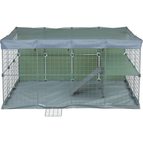Habitat modulable Neopark pour lapin nain. - Composé de : 32 panneaux de 35x35cm (11 panneaux pleins + 21 grilles dont une avec porte) + des clips + une échelle avec tissu de protection coloris gris clair. - Inclus : le tapis de sol (coloris gris clair) + filet de protection (coloris gris clair). -