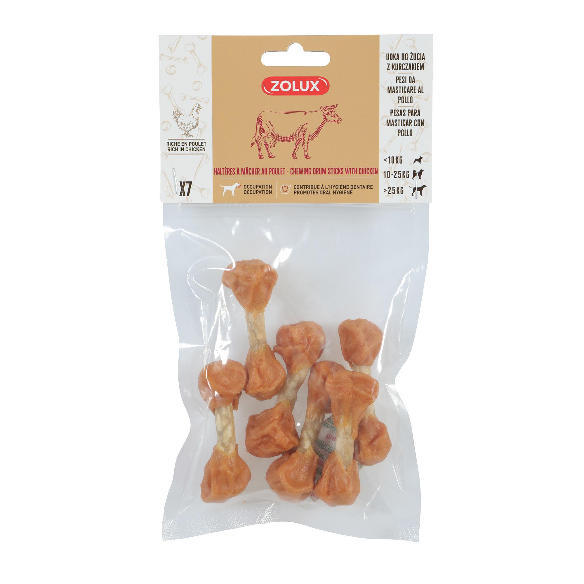 Haltères à mâcher au poulet - Zolux: Le goût et l'hygiène dentaire réunisUne recette savoureuseLes haltères à mâcher au poulet de Zolux sont élaborés avec 72% de poulet, offrant une expérience gustative inoubliable pour votre chien. Composés également de peau de bovin, ces snacks sont conçus pour ré