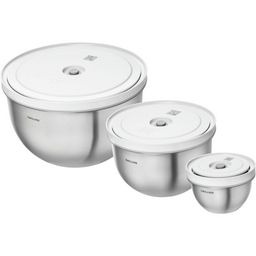 | Descriptif | Set de 3 bols sous vide ZWILLING FRESH & SAVE (S/M/L). Préparez, servez et conservez vos aliments jusqu'à 5x plus longtemps*. Empilables, hermétiques, compatibles lave-vaisselle et congélateur. Idéal pour une cuisine organisée au quotidien. *Vs conservation altique. | |