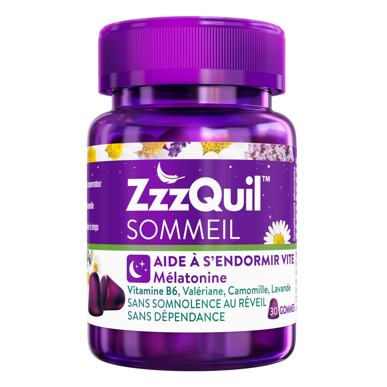 Parce que quand vous dormez bien, vous êtes au top, nous avons créé ZzzQuil Sommeil, des gommes douces au goût des fruits de bois qui contiennent 1mg de mélatonine, une hormone naturellement présente dans notre organisme qui agit sur notre cycle de sommeil et réduit notre temps d’endormissement. La formule contient également 1,4 mg de vitamine B6 et un mélange d'extraits de camomille, de valériane et de lavande.